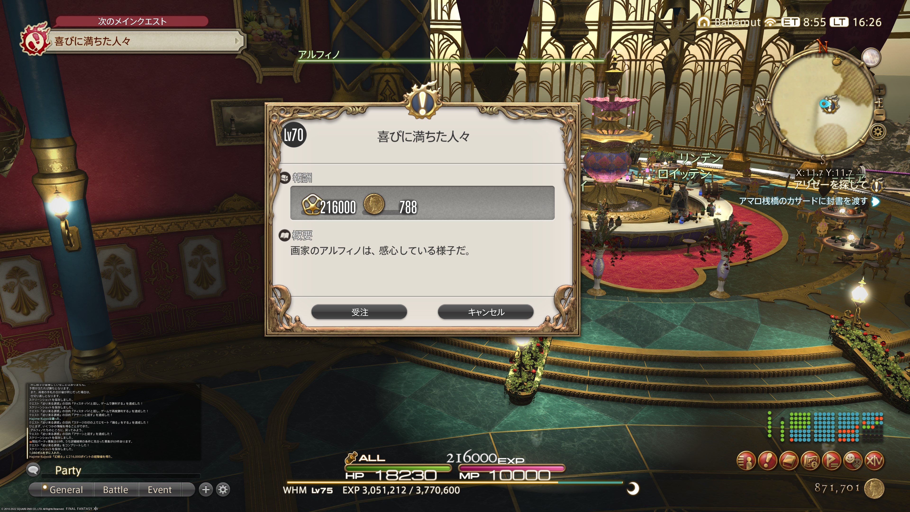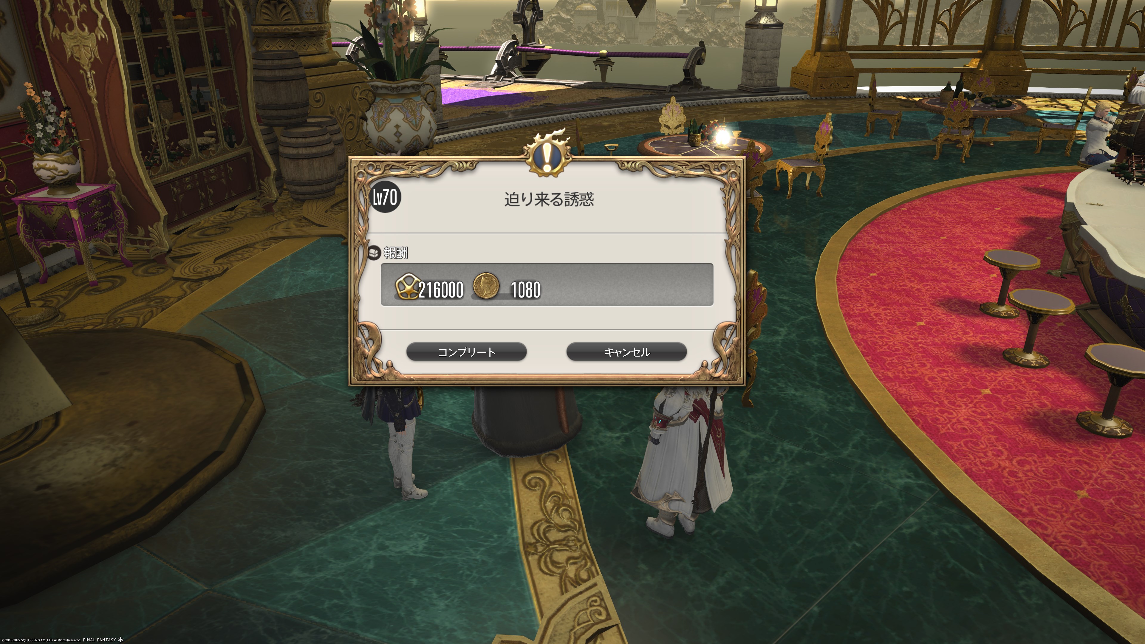 画家を探しているという夫婦のもとへ。アルフィノが話している内にユールモア内部を探索します。情報を聞くために謎のミニゲームを行ったりしつつ、ある程度の情報を集めました。どうもユールモアは罪喰いの被害を受けないらしいです。その原因は元首であるドン・ヴァウスリーという人物が関わっているとのこと。う~ん......水晶公から聞いた罪喰いはこの世界の脅威だったはず。それを手なずけられるとは思えないのですが、どういうことなんだろう。その情報を伝えるためにアルフィノの元へ戻るとアルフィノの服装が変わっていました。新しい服を貰えるとは良いねぇ。