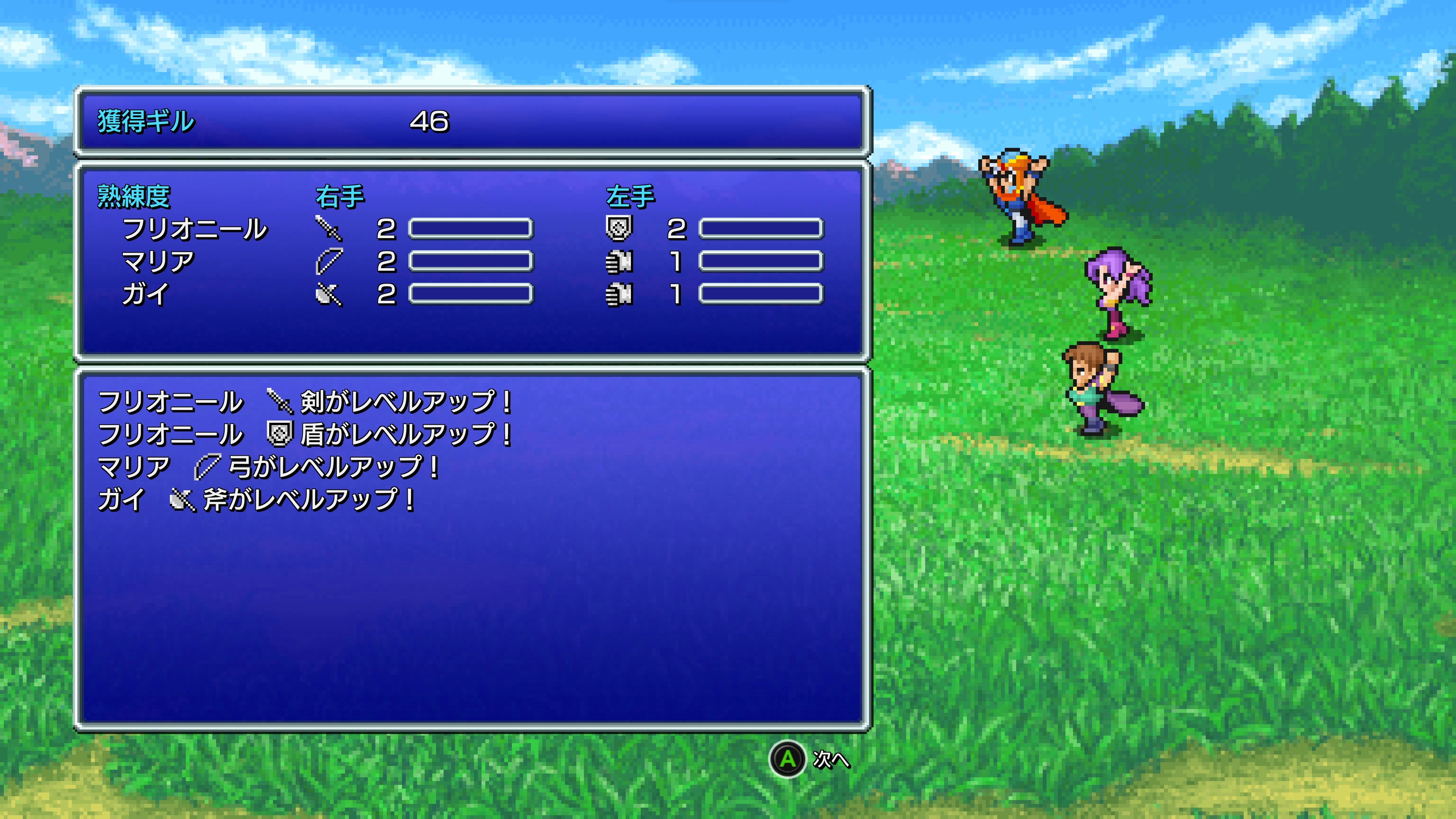 さて、今回はミンウから情報を得た、フィンへ向かうことにします。フィールドの操作感や戦闘はFF1と変わりないので、ここらへんはすんなり入ることができました。違う点としては熟練度やステータスの伸ばし方でしょうか。これはかなり癖のあるシステムですよねぇ。HPを伸ばしたいなら敵からダメージを受けてHPを減らす必要があったり、武器や魔法の熟練度で性能が変わったりと、割りと複雑。しかし、こういう尖ったシステム、私は割と好きだったりしますwとっつきにくさはありますが、慣れの問題でしょう。最初はあまり深く考えず、ストーリー進行をメインにやっていくことにします。
