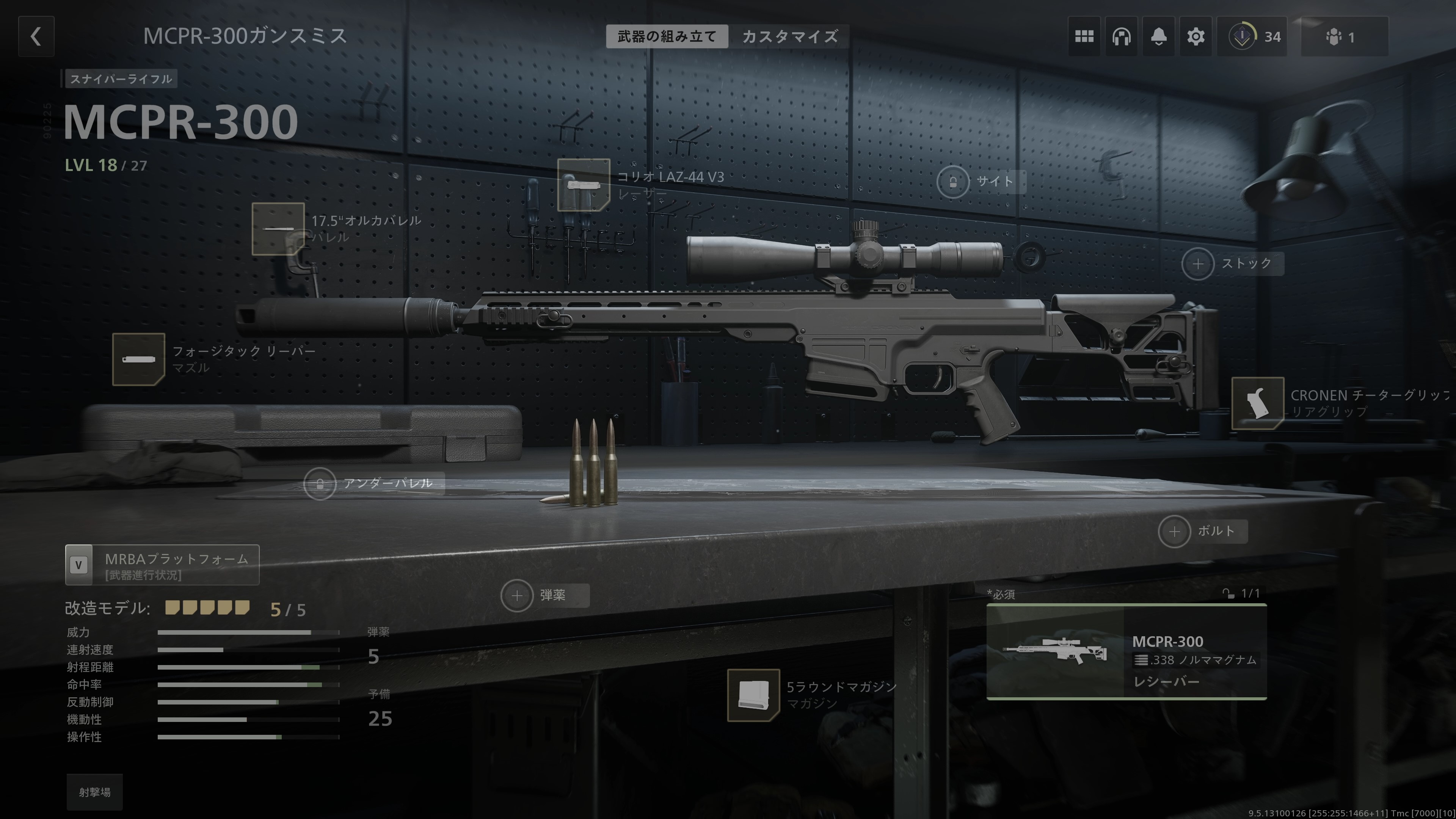 使用感はそこそこ良い感じ。MW1のSRって結構重ためな挙動だったのですが、今作のSRはやや軽めな印象を受けます。このMCPR-300も最初こそ重たいですが、レベルを上げるとほとんどのアタッチメントでエイム速度アップを付けることがで、かなり快適になります。最初は大規模マップでちまちま武器レベルを上げていましたが、ある程度アタッチメントが揃ったら通常マッチでも割りと使えるようになりました。これは嬉しい限りです。まだレベルは最大ではないので、根気強くレベル上げを行おうと思います。
