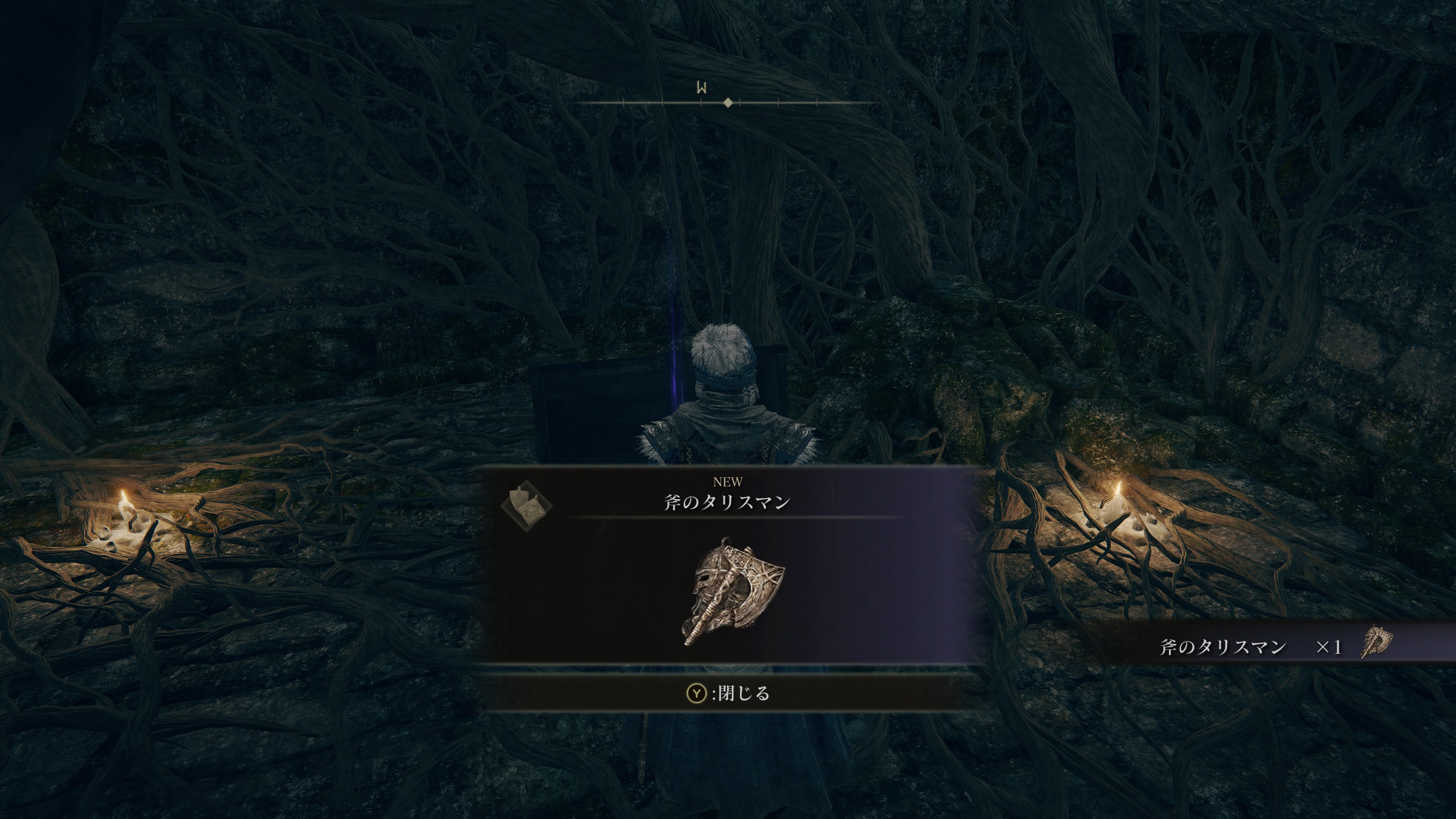 この廃墟にも巨大熊がいて襲ってきたのですが、無視して地下へ続く道へ。その先には斧のタリスマンが。ソウルシリーズだとタリスマンは信仰スペルを使用するための触媒でしたが、ELDEN RINGはアクセサリー扱い。斧のタリスマンは装備するとタメ攻撃の威力をアップさせてくれるようです。脳筋武器を使用したいので、このタリスマンは相性が良いかもしれないですね。とりあえず今は他に装備できるものもないので、装備させておくことに。