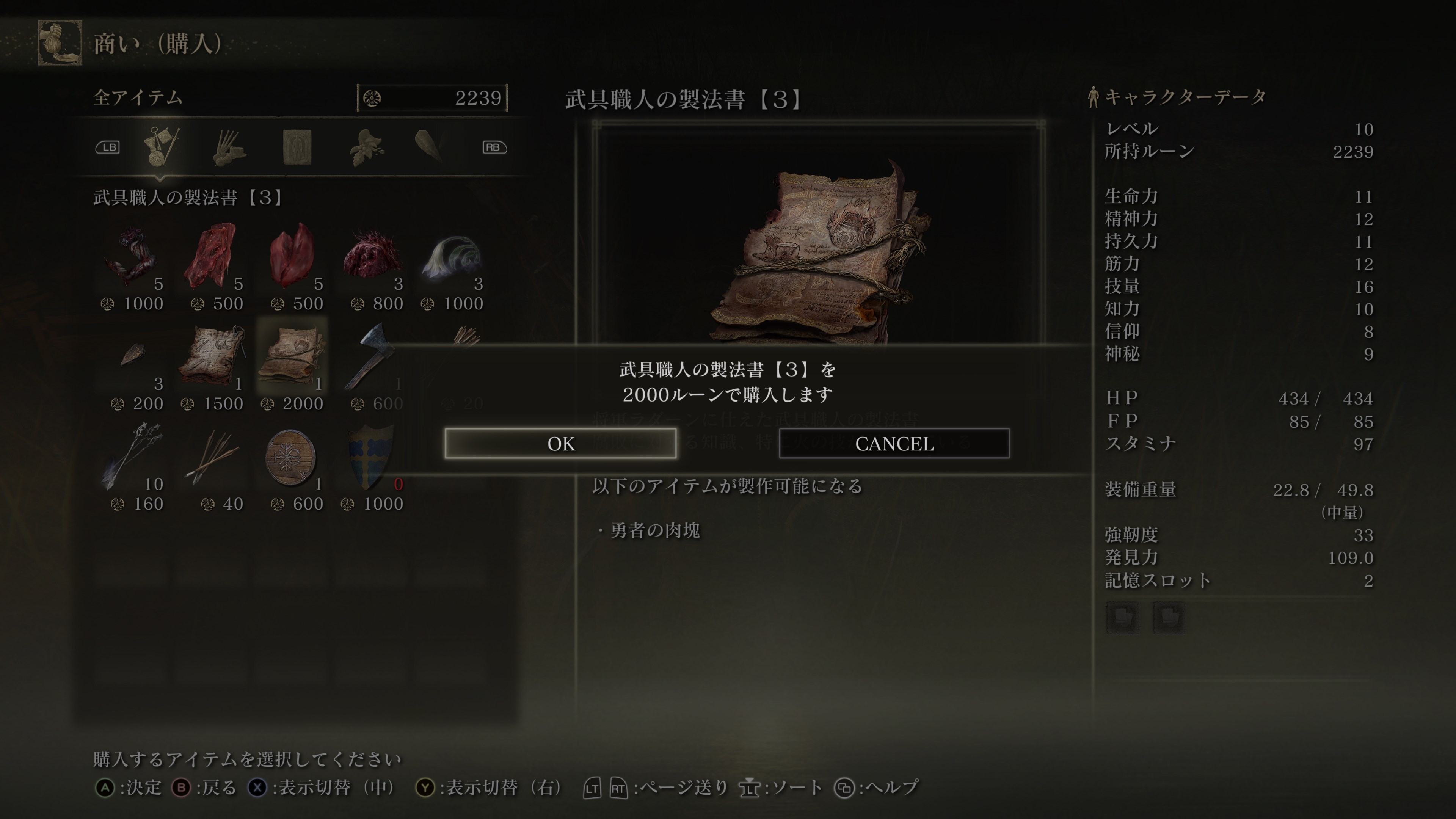更に探索を続けると地面に「商い、やってます...」のメッセージが。近場を探してみると商人を発見。彼から青金のカイトシールドと武具職人の製法書【3】を購入。これでようやく物理カット100%の盾が入手できましたw今まで使用していた盾は物理カット100%じゃなかったので、ガードしてもダメージ受けてたんですよねぇ。これで多少戦闘が楽になりそう。