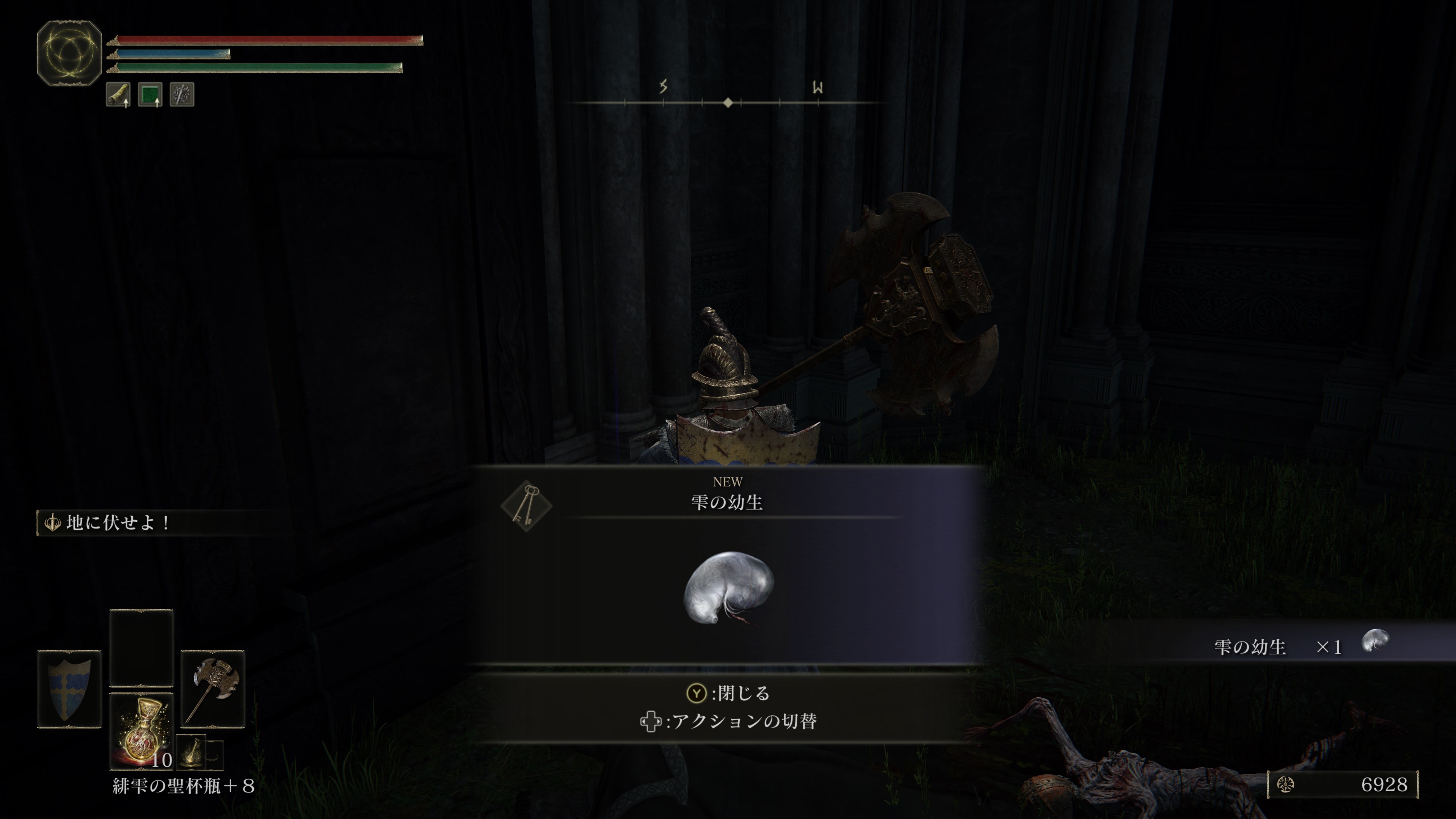 ともあれ、ひとまず穴を降りて行くことに。かなり長い道を歩いて、ようやく永遠の都、ノクローンに到着です!このダークな雰囲気、たまりませんねぇ。いくつかアイテム回収。ここで回収したのは、霊姿摘みの鈴玉【1】、雫の幼生、大盾兵の遺灰。大盾兵の遺灰はヘイトを取ってくれる感じがするので強化しても良さげかなぁ。