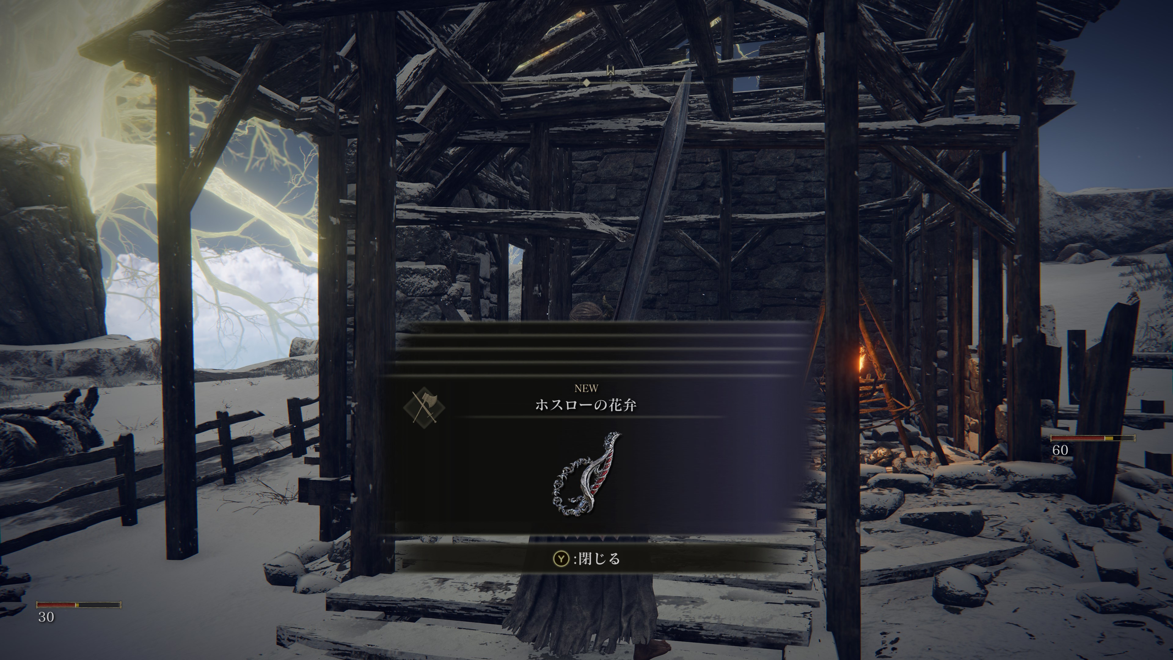 今回は巨人たちの山嶺にて火山館イベントをこなし、ライカードと戦います。まずは血潮の騎士、ユーノ・ホスローの世界に侵入。これまでの侵入はそこまで苦労しなかったのですが、こいつは別格。とにかく強い。こちらの攻撃をしっかり回避してきますし、出血属性つきの攻撃をしっかりと連続で当ててくるので、ちょっとしたミスであっという間に出血して大ダメージを貰ってしまいます。かなり苦戦をしてなんとか勝利することができましたが、最近苦戦してゴリ押しで勝つパターンが増えてきたので、ちょっと冷静に対処できるようにならないといけないなぁと反省w報酬はホスロー花弁とホスロー一式。完コスできますね。