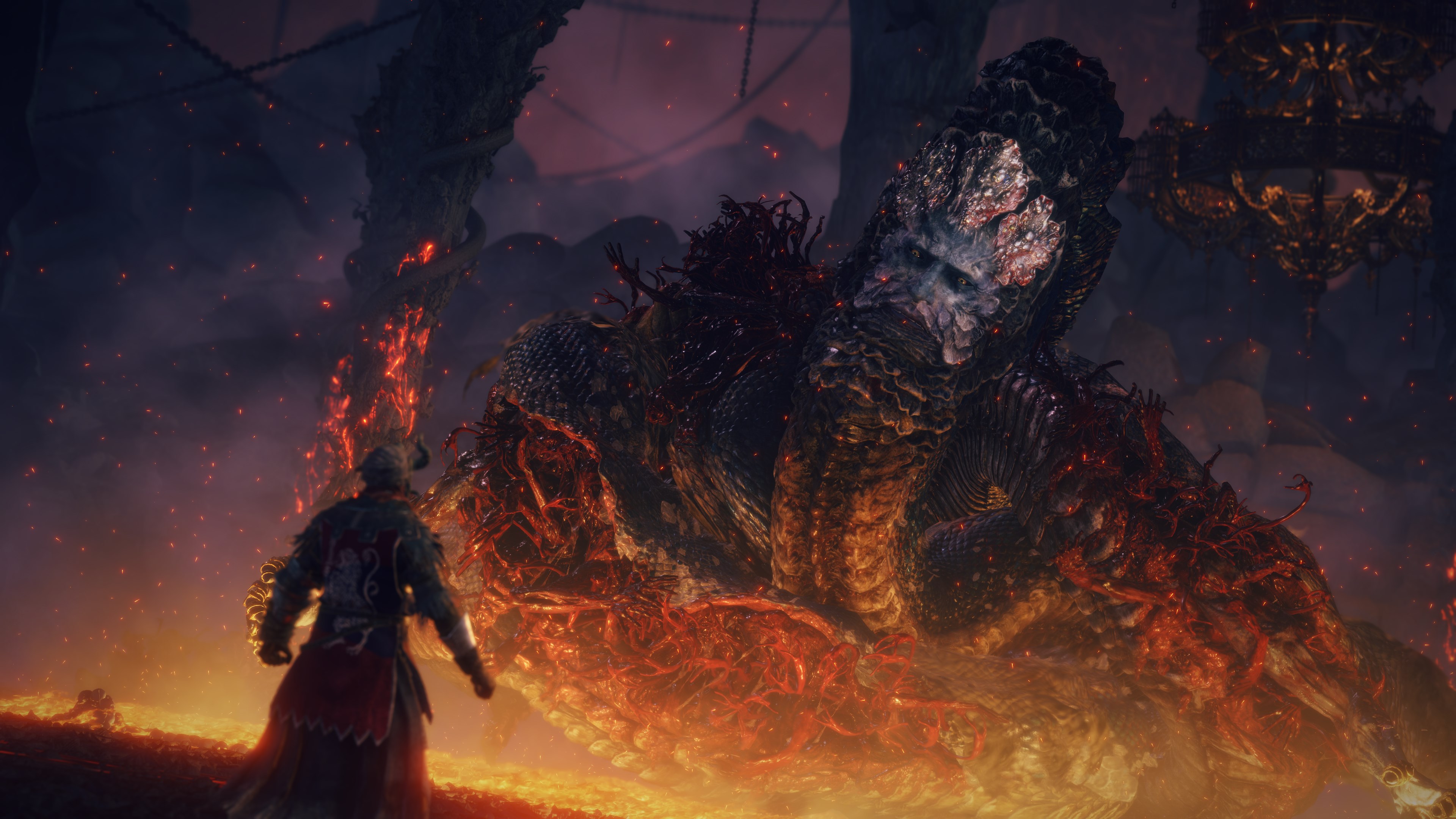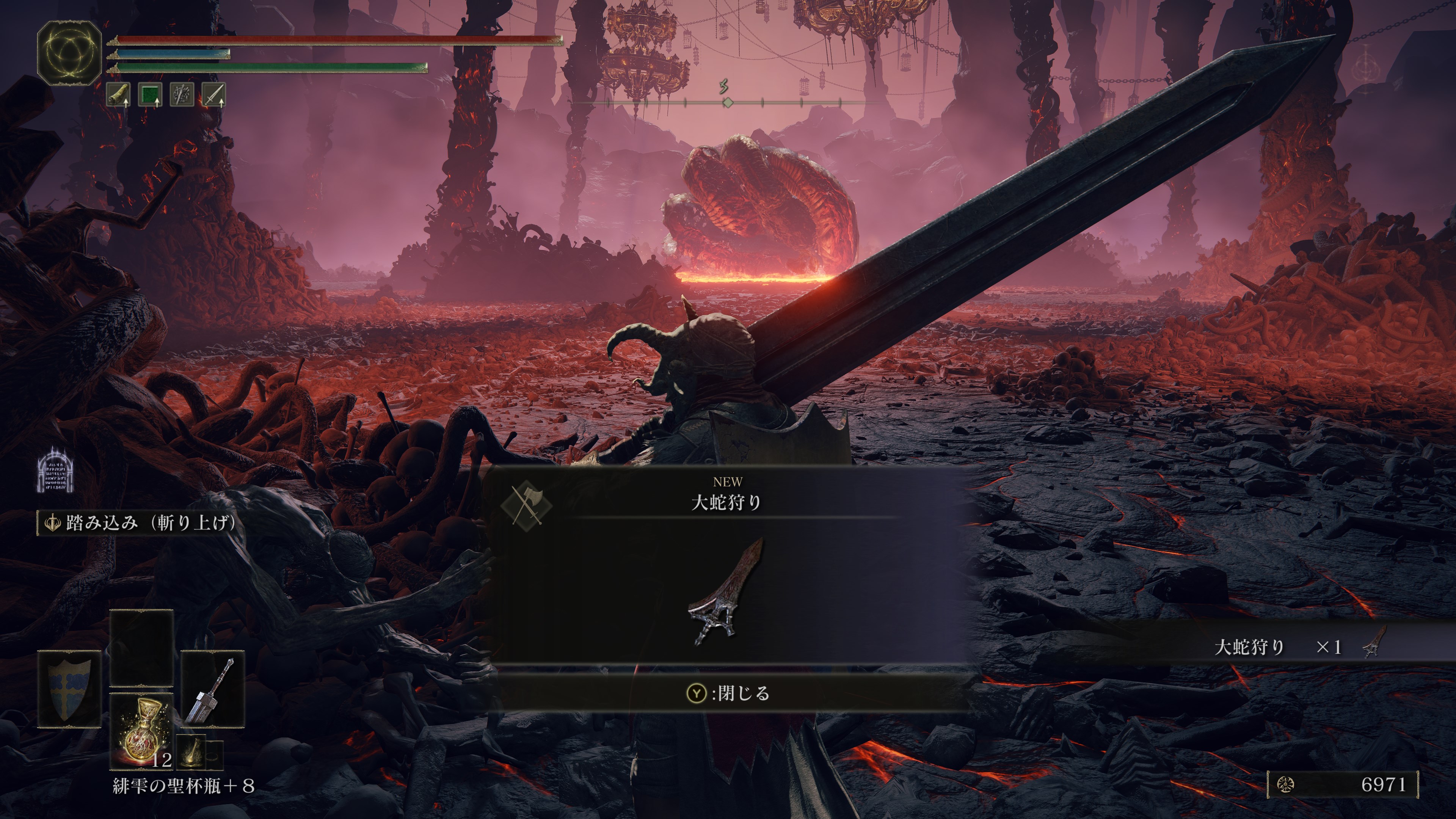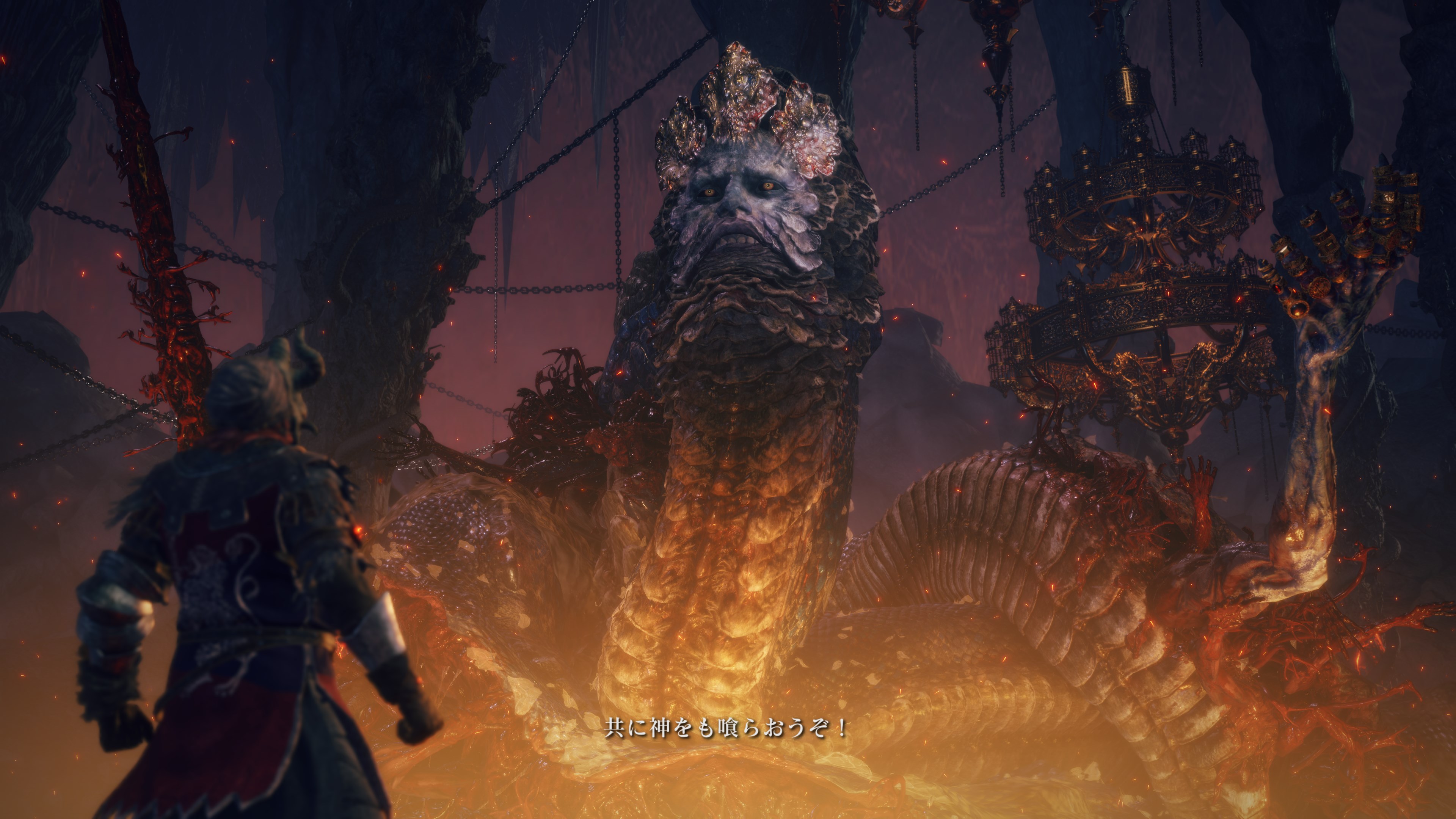 その後、実力を認められて王に見えるかどうかの選択肢が。ここはもちろんイエスマン。案内しようと言われて画面が暗転すると出口のない洞窟にワープ。ボス霧を抜けるとそこにはボス「神喰らいの大蛇」が。ここでは以前火山館の客間前の廊下にいた人に教えてもらった武器である大蛇狩りを使います。これは戦技で斬撃を飛ばせる武器で、このボス専用の武器になります。この武器、盾チクがとにかく強いのです。スタミナがあるキャラであれば、ひたすら盾チクしているだけで完勝できますw