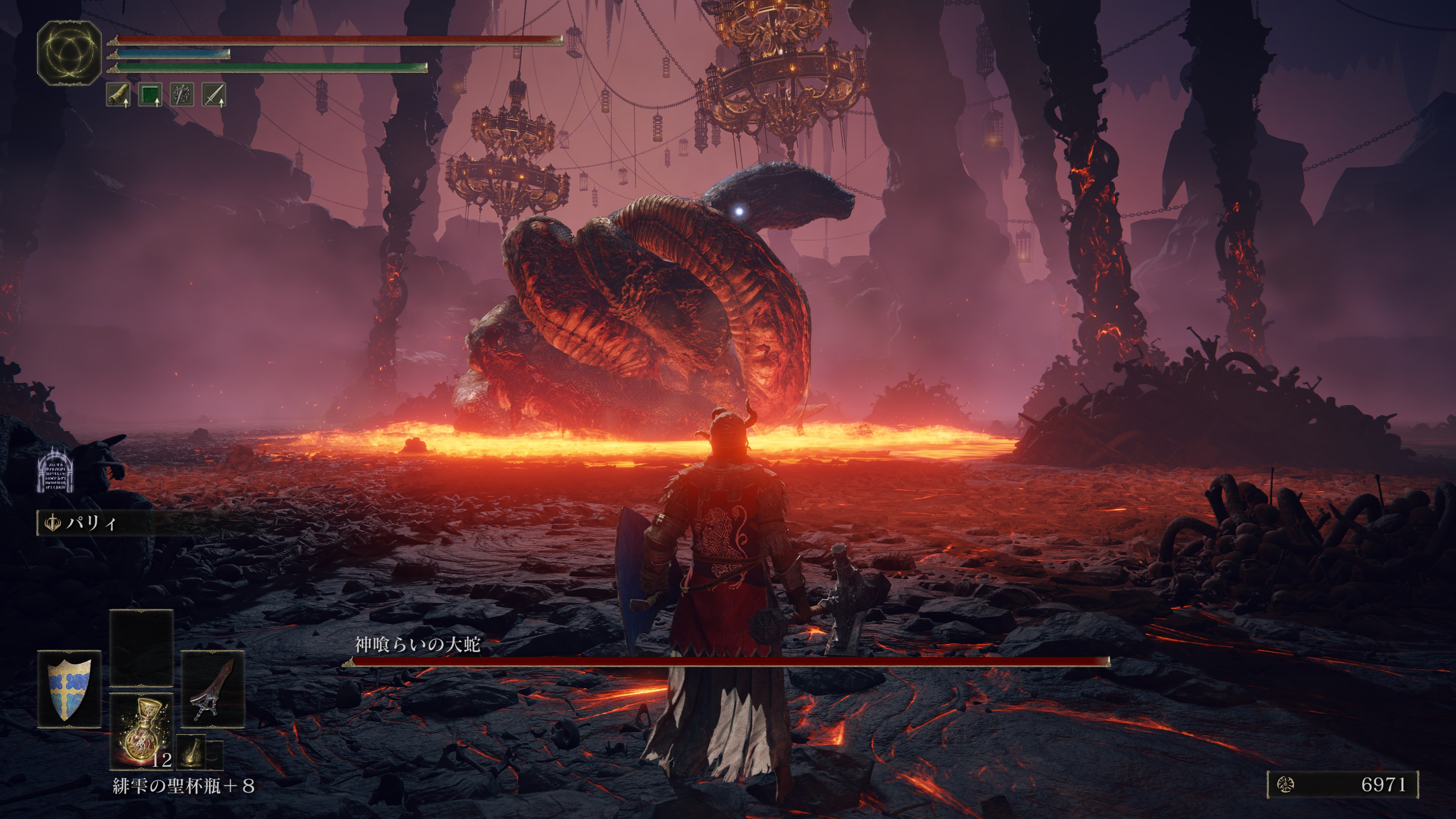 さっくり敵を倒すと、大蛇の中から顔が出現。どうやらこいつが火山館の主であるライカードのようですね。ライカード戦ですが、大蛇戦と同じくひたすら盾チクが有効。隙ができたらタメ攻撃を与えて大ダメージを狙っていきます。とにかく作業みたいなボス戦なので、ちょっと退屈なのがなぁというボスでしたw