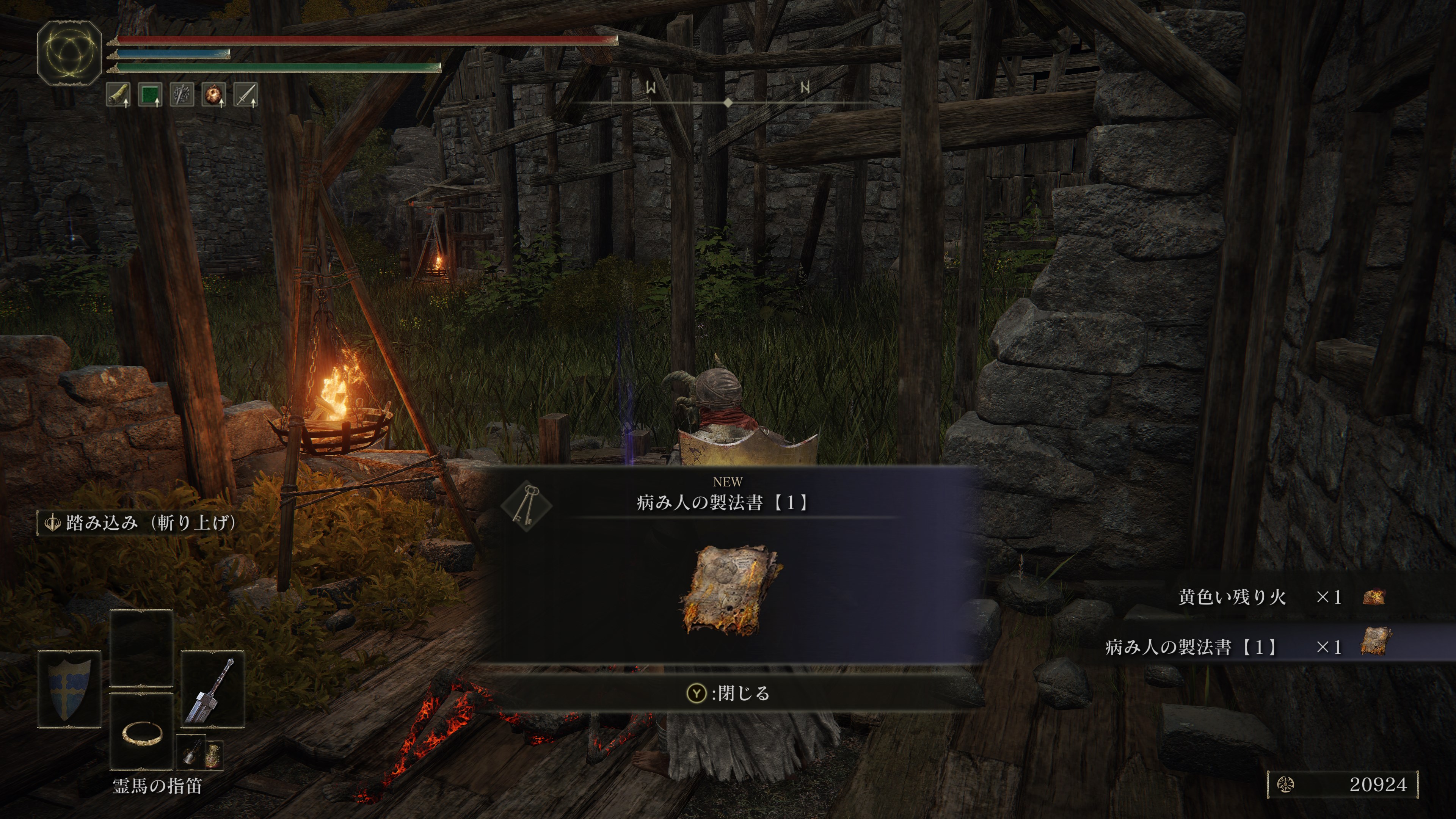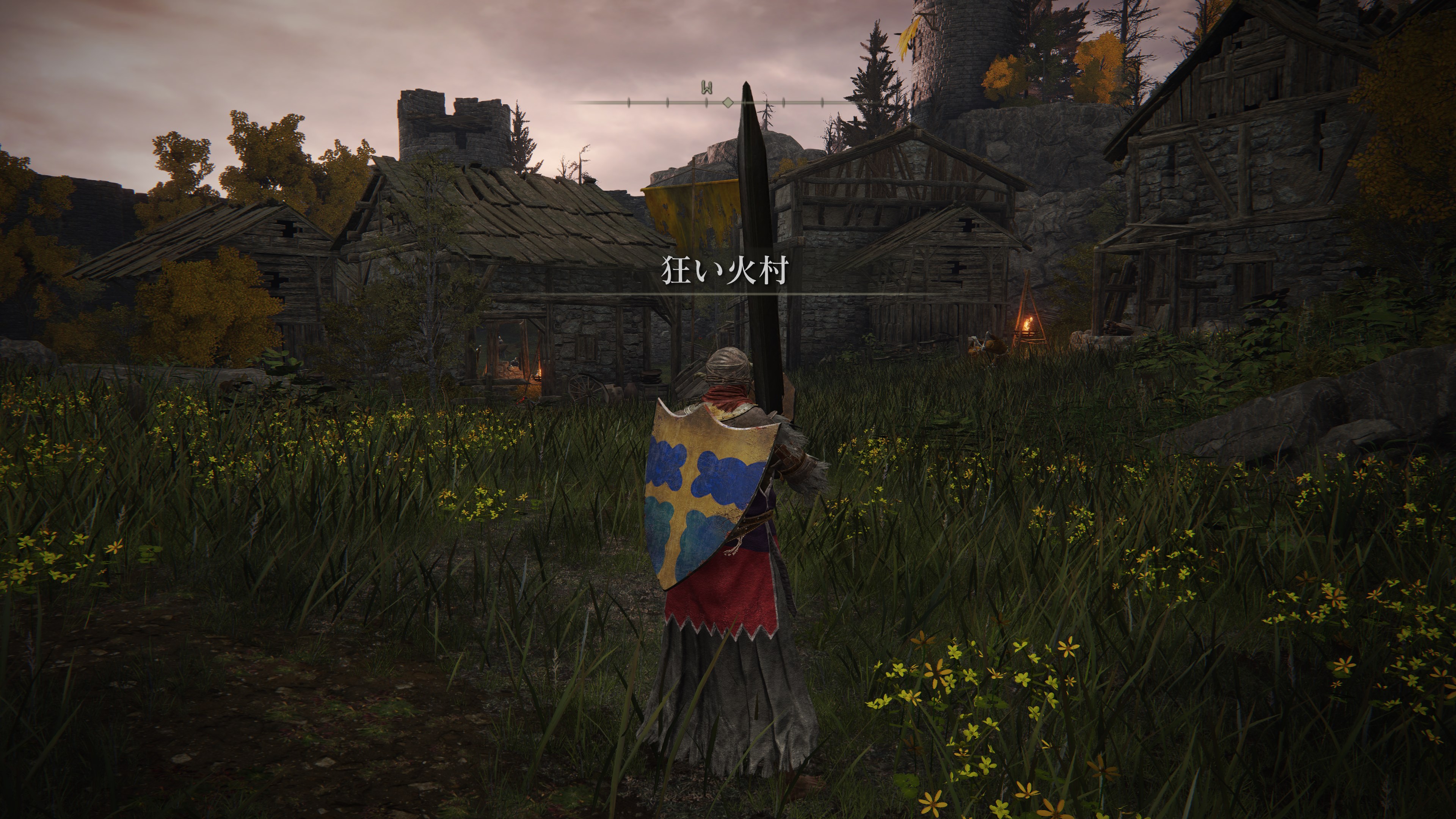続いては狂い火村。先程の狂い火の灯台の近くにあります。ここでは病み人の製法書【1】、シャブリリの禍を入手。シャブリリの禍は敵に狙われやすくなるという超特殊な効果を持った頭装備。縛りプレイ用意外に使える場所ってあるんでしょうか?w