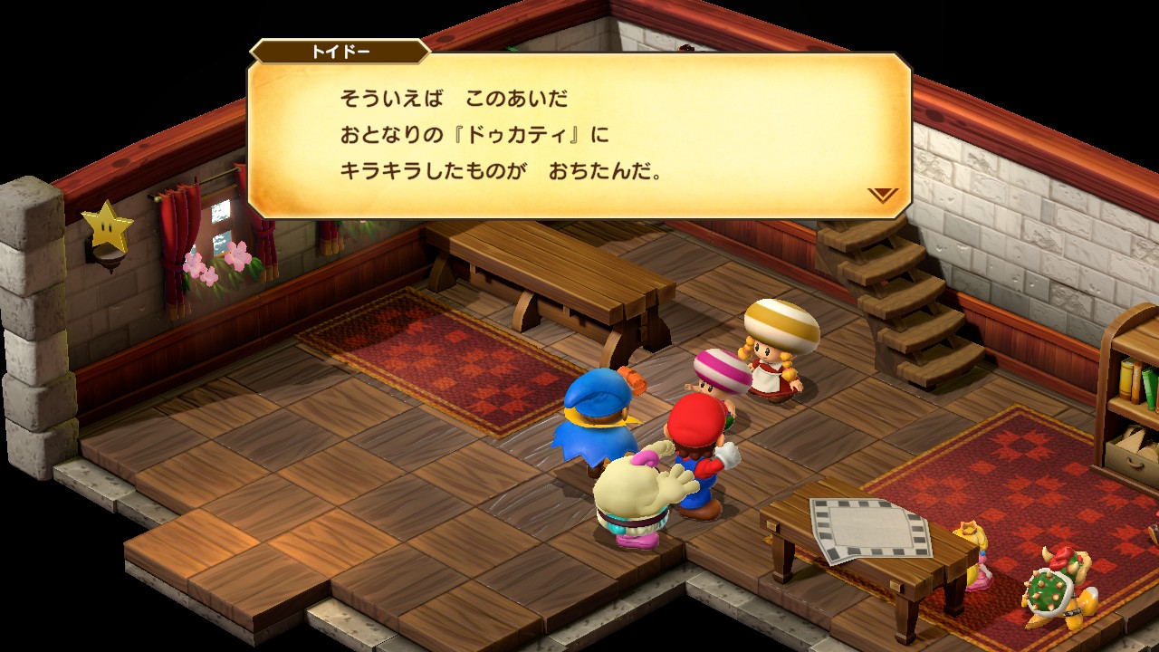 ローズタウンの宿屋に帰って報告。宿屋の子供がマリオを煽って、その煽りにマリオがブチ切れるシーン好きw他のマリオシリーズではなかなか見ることができないマリオの一面ですよねw