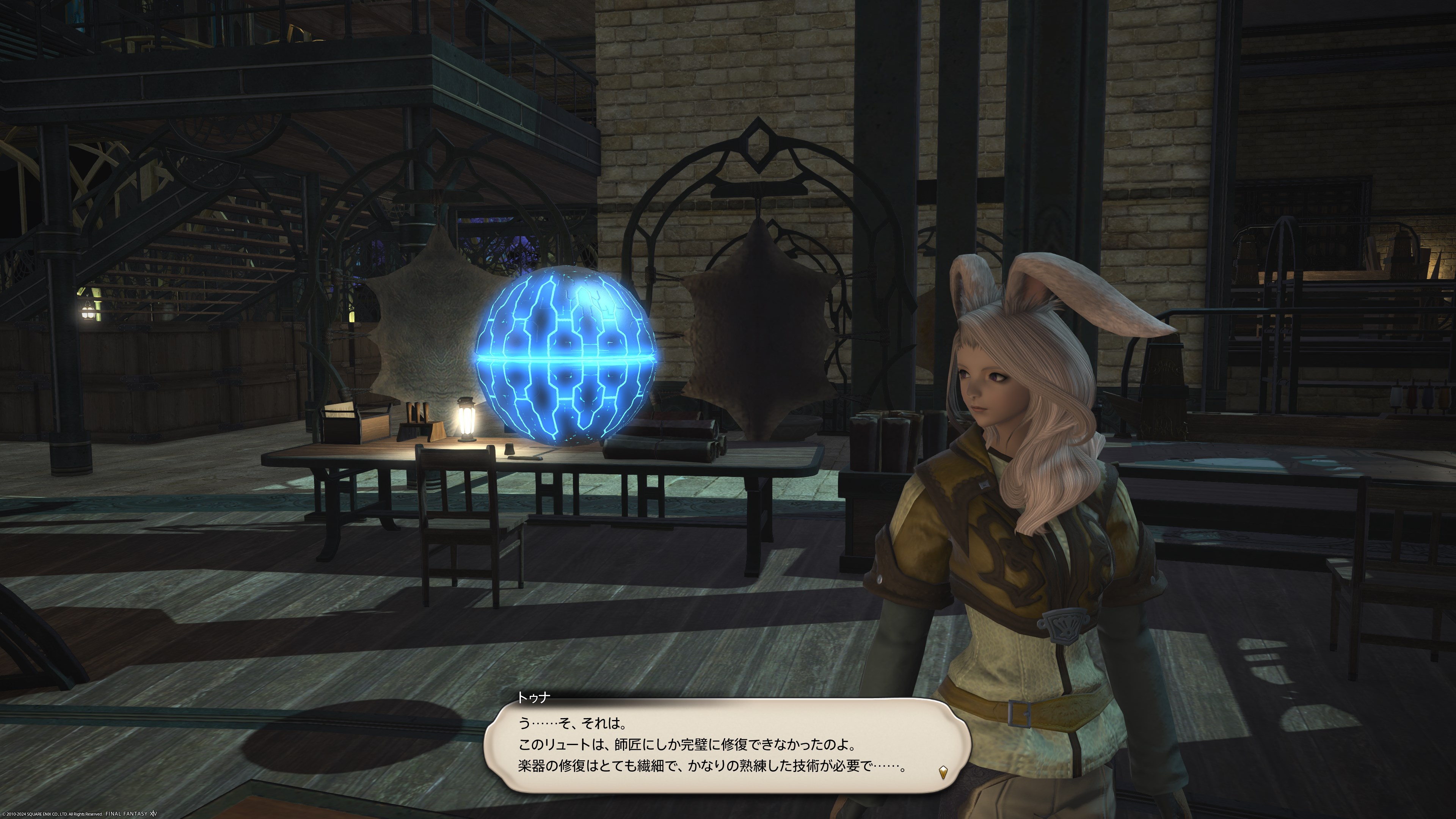 続いて師匠から貰ったリュートの話が展開され、このリュートを修理することに。リュートの修復材はシースワローの粗皮集めが大変でした。こちらもバイカラージェムで交換できるので余裕がある場合はそちらを推奨します。敵からのドロップ率がかなり渋くて、なかなか必要個数集められませんでした。
